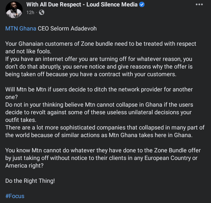 Kevin Taylor, a popular Ghanaian journalist who is the CEO of Loudsilence Media, a broadcasting company based in the U.S., has fired MTN for taking down their zone bundle service, an affordable bundle for all MTN users in this hard time without any notice.