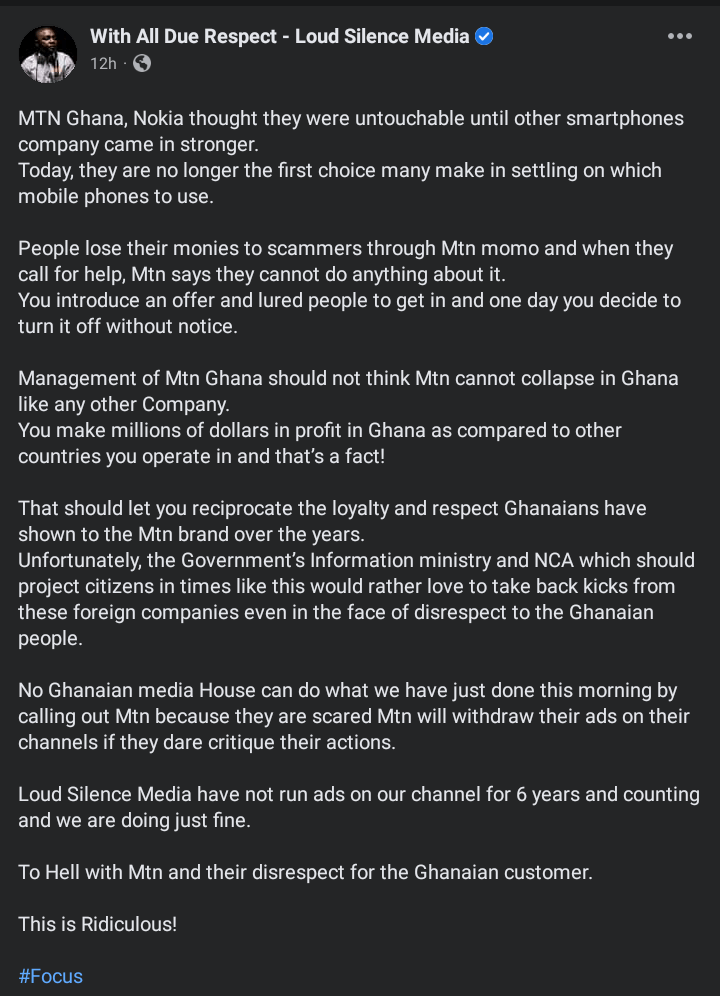 In a Facebook post, the controversial journalist tagged the CEO of MTN Ghana, Selorm Adadevoh, and also criticized the network service company that they are aware that this is not acceptable in any advanced countries like America and Europe and if they are a high profile company, why should act this way. He said in his post that Nokia thought they were the only smartphone company until other powerful companies emerged and now Nokia is struggling to remain relevant by competing with the best and if MTN is not careful, their revenue and customers will reduce drastically since they do not offer their customers the respect they deserve.